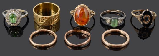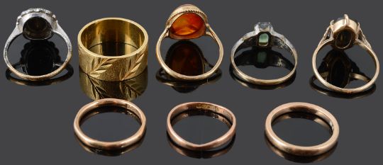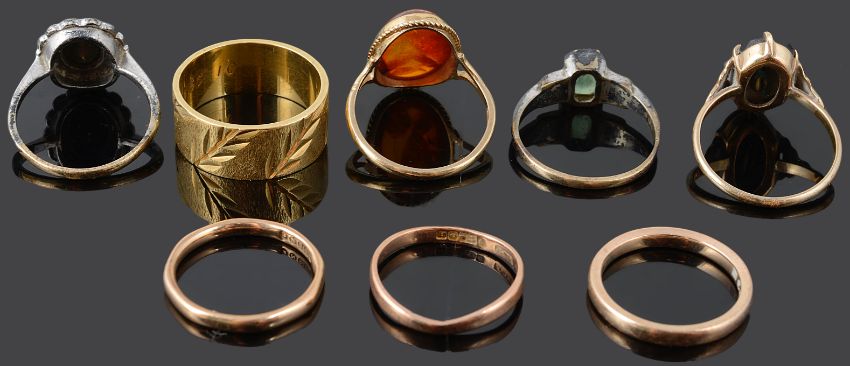 the 18ct gold band with bright cut decoration, together with three 9ct gold narrow bands, a contemporary 9ct gold amber set ring, an onyx initial 'C' ring, tests for gold and two silver mounted dress rings (8)