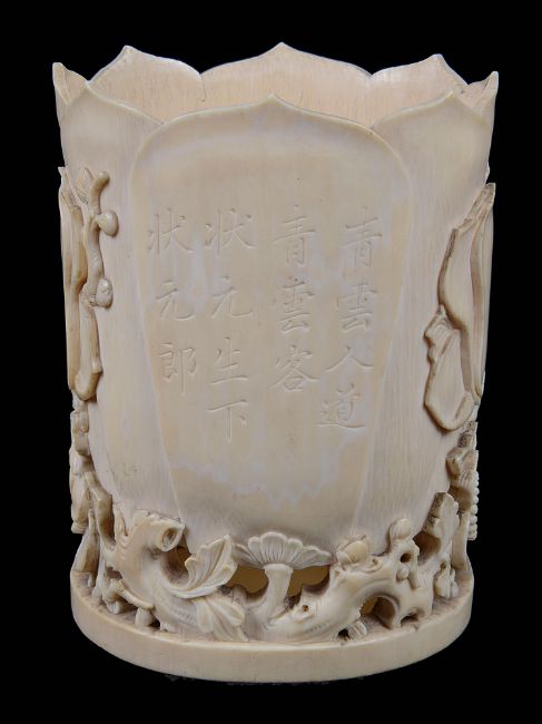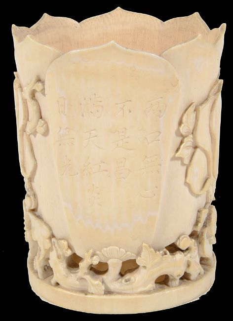 the body formed as lotus petals with pierced blossom branches to base and sides, the front and back petals inscribed with a poem and having inscribed signature