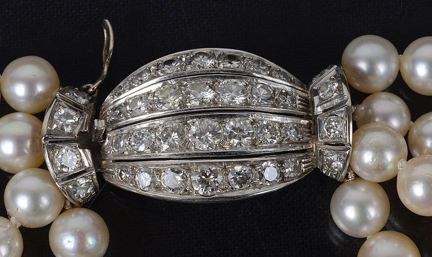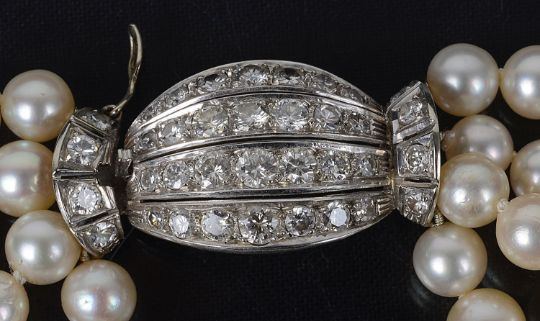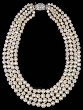 An impressive four row cultured pearl necklace with diamond set clasp