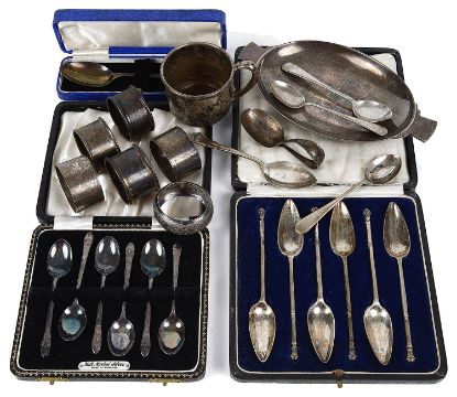 comprising a Mappin & Webb Art Deco small oval twin handled footed dish, stamped Mappin & Webb Sterling, together with a cased set of six grapefruit spoons, London, 1926, by David Landsborough Fullerton, a cased set of six coffee spoons, a christening mug, a christening spoon, a cased spoon, six assorted napkin rings, three teaspoons and a plated jam spoon (qty)