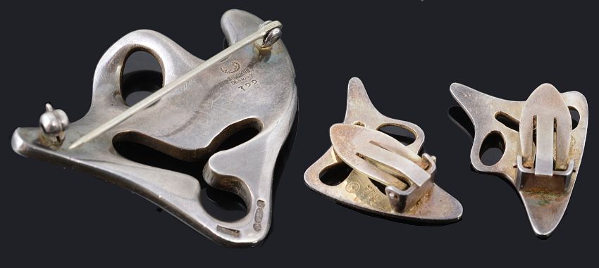 the heavy sterling silver brooch and earrings fully marked and with original cardboard Jensen box (2)