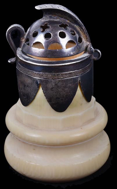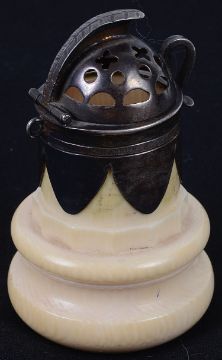 crested domed pierced hinged silver cover with loop catch and suspension ring, on a turned ivory body