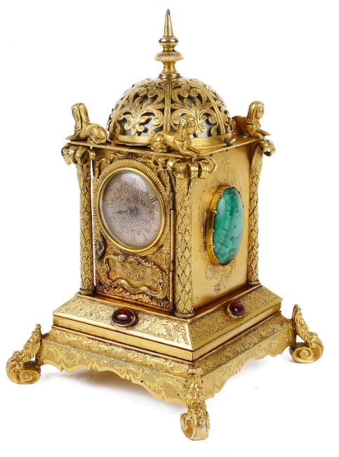 the two train movement signed Emanuel Brothers 113 silvered dial and striking on a top mounted bell, the highly decorated case with columns in the form of palm trees surmounted by sphinx, and 'jewelled' with malachite and garnet cabochons and agate to reverse, raised on four scroll feet with applied mask heads