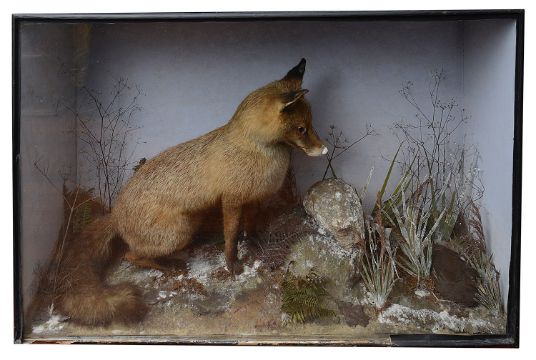Taxidermy: A Victorian red box fox and a moorhen seated in by faux rock work and a sitting moorhen by a pool in naturalistic winter setting, painted backboard and sides, glazed fronted ebonised caseheight 69 cm., width 104.5 cm., depth 33 cm.Condition: Case bottom slightly distressed with loss to bottom left corner Please note we would be grateful if collection can be made by 4pm on Friday 29th November from the auction venue at Farleigh Golf Club.