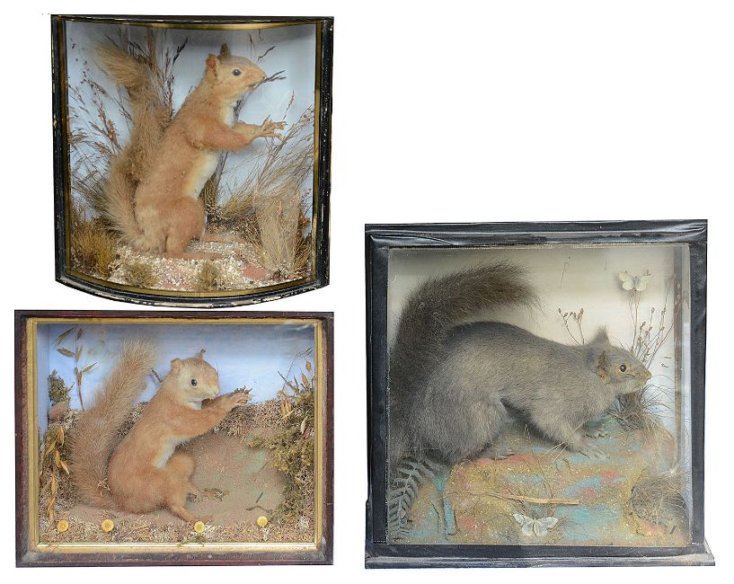 Taxidermy: Three Victorian cases of squirrels the first a red squirrel by W. Gibson, in a naturalistic setting, in a bow fronted case with verre eglomise border, bears label W. Gibson Naturalist 19 Sheen Grove London, together with two other cases containing squirrels, (3)First height 28.5 cm., width 17 cm., depth 13 cm.Condition: First with some mite damage, otherwise fine. Other two cases in fair condition Please note we would be grateful if collection can be made by 4pm on Friday 29th November from the auction venue at Farleigh Golf Club.
