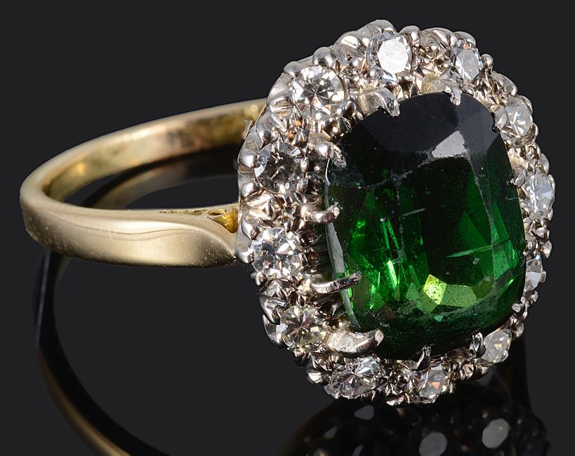 the oval tourmaline set within a single row border of diamonds, mount tests for gold