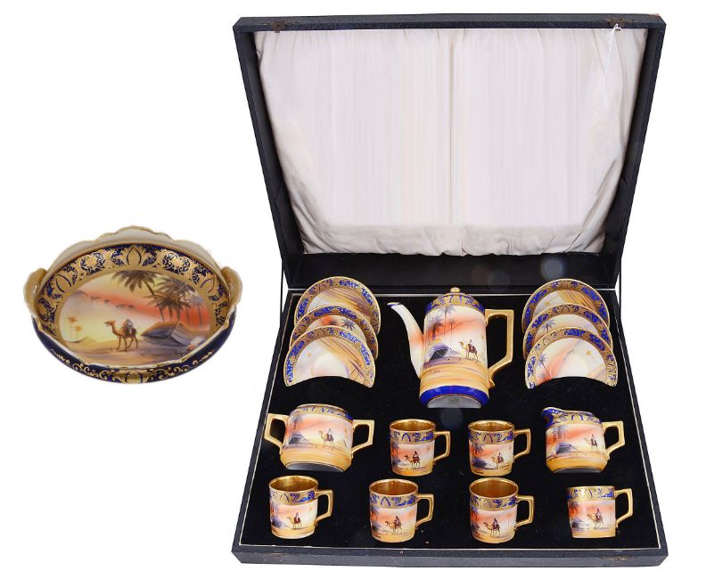 comprising coffee pot and cover, twin handled sugar basin, milk jug, six coffee cans and six saucers, in a fitted case, together with a matching Noritake bowl, each piece painted with a desert scene with a Bedouin mounted on a camel, a tent, palm trees and a pyramid, signed K. Asai, gilt tooled cobalt blue border, printed marks, (16)