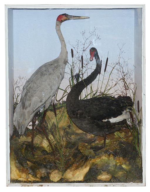 Taxidermy: A Victorian black swan and a cranein a naturalistic setting with faux rocks, blue painted backboard and sides, glazed fronted ebonised caseheight 145.5 cm., width 103.5 cm., depth 40.2 cm.Condition: Good condition, white sealing tape round the case little distressedPlease note we would be grateful if collection can be made by 4pm on Friday 29th November from the auction venue at Farleigh Golf Club.