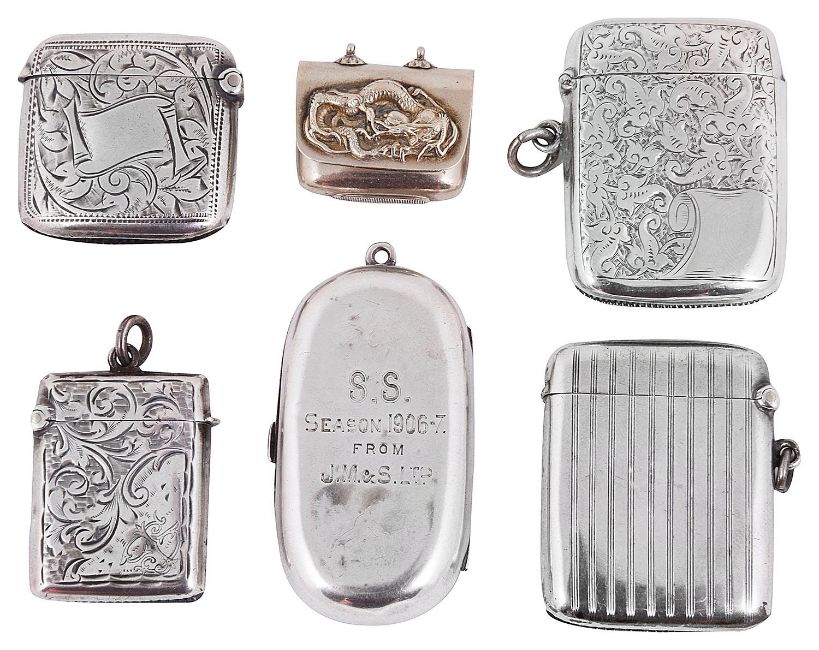 Condition: Sovereign case with wear and dents. Largest vesta engraved with foliate design slight pushed, otherwise all silver vestas in age commensurate condition. oriental vesta case slightly worn