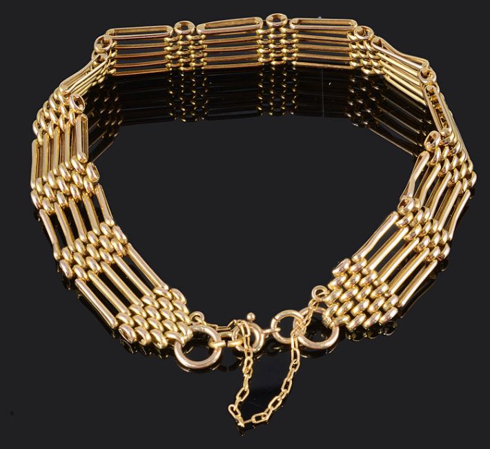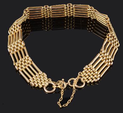 the bars spaced with woven chain links, tapering to either end and with fitted safety chain