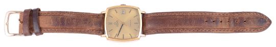 the gold squared dial with gold hour batons, black hands and calendar aperture, stainless steel back, leather bracelet
