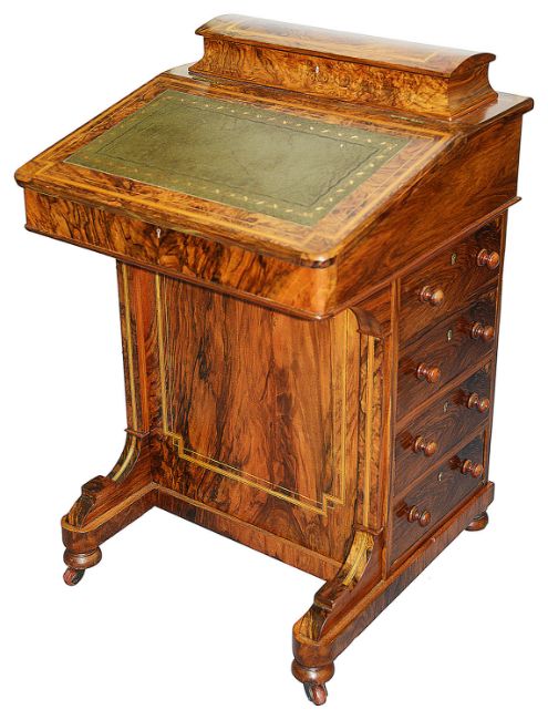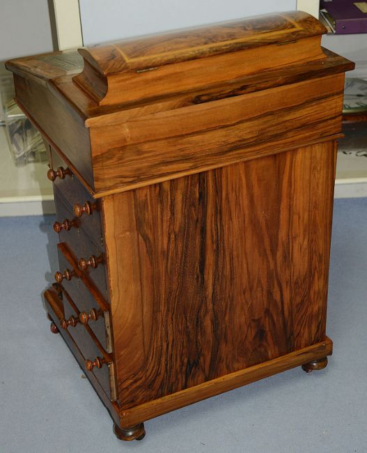 A Victorian burr walnut davenport deskthe top with hinged domed stationary compartment above a sloped front inset with gilt tooled writing leather, enclosing a maple interior fitted with drawers, above four drawers with turned handles to one side and dummy fronts to the other, raised on compressed bun feet and ceramic castersheight 47.5 cm., width 55.5 cm., depth 54 cm.Condition: Good condition. Re-polished. Outer crossbanding of maple veneer to lid interior replaced.Collection is required by 4pm on Friday 29th November from the auction venue at Farleigh Golf Club.