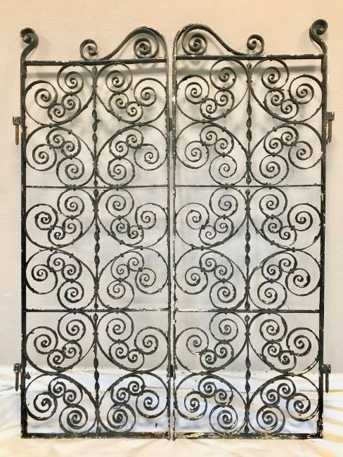 A pair of early 20th century black painted wrought iron garden gateswith scroll decoration height 157 cm., width 122 cm., hinge to hinge 129 cm. Condition: Good condition, paint flaking. Please note that due to the size of the gates,Collection is required by 4pm on Friday 29th November from the auction venue at Farleigh Golf Club.