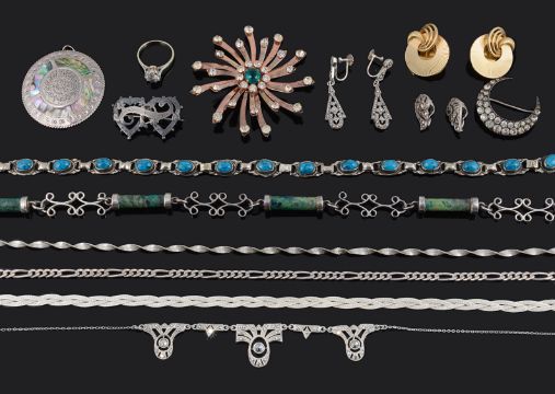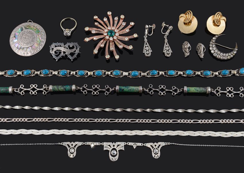 another Mexican turquoise set necklace, a 1940's Sterling rhinestone necklace, a pair of vintage Boucher gilt earclips, two Victorian silver brooches and other silver items (qty)