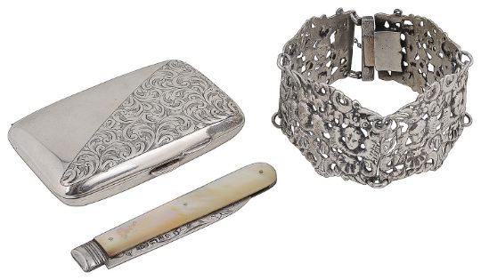 A late 19th century Continental white metal panel bracelet, A Victorian silver bladed and mother pearl folding pocket knife and a silver hip cigarette case, the bracelet probably Dutch, unmarked, pierced with a design of winged cherubs and shells within a foliate scroll design, the pocket knife, Sheffield, 1866 by Brookes and Crookes, the blade engraved with fruiting vine and a cigarette case half engraved with scrolling foliate decoration. (3)