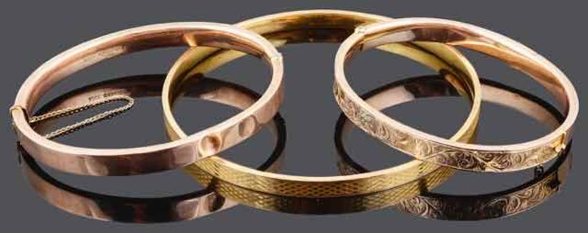 each hinged oval bangle engraved with foliate design, one fitted with safety chain together with a 9ct gold metal core slave bangle with engine turned decoration, (3).