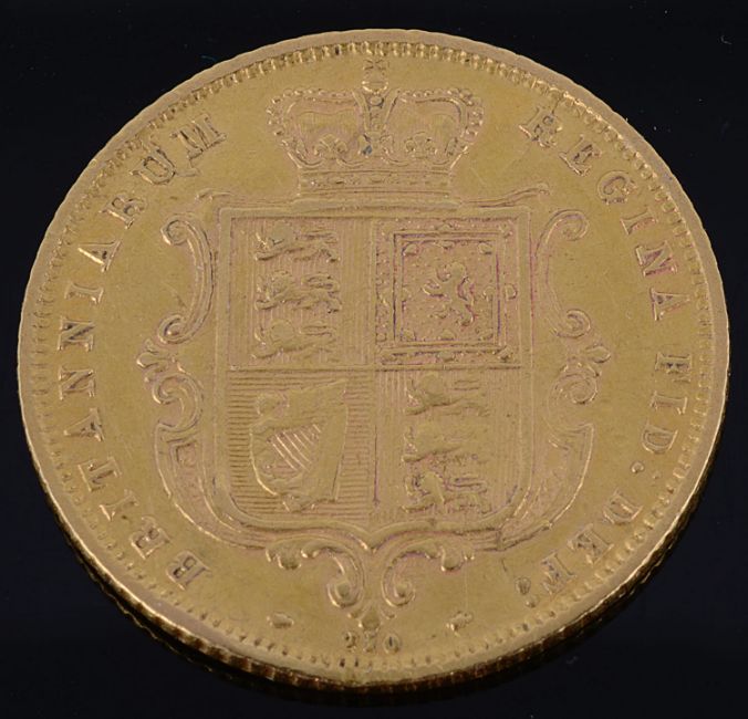 the coin 0.916 gold, obverse: young head facing left, VICTORIA DEI GRATIA; reverse: crowned royal shield, BRITANNIARUM REGINA FID. DEF.