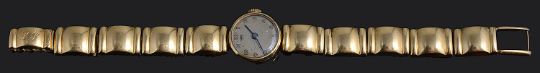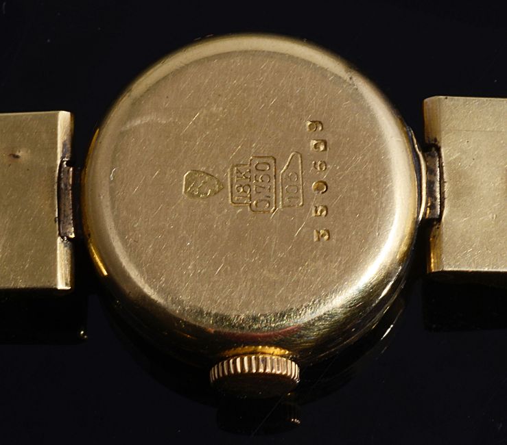 the circular dial with Arabic numerals, the bracelet with arched ribbed bar links, the reverse of the watch stamped 18K, the bracelet marked 750 and engraved with owners initials L.P
