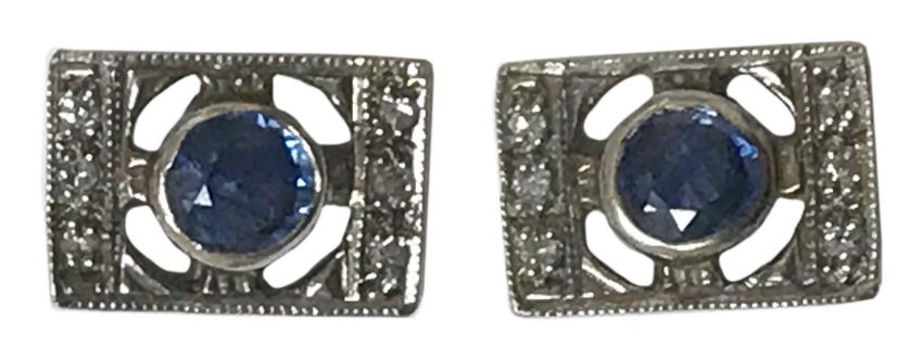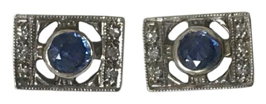 of rectangular form with centre set sapphire surrounded by diamond points, in white gold mounts