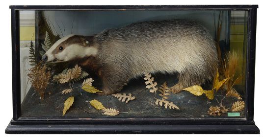 Taxidermy: A Victorian badgerin a naturalistic setting with fallen leaves, in a three glass ebonised case on plinth base height 41.5 cm., width 80.2 cm., depth 32 cm. Condition: Acquired by the current vendor from Christopher Frost 'The Enchanted Aviary' during the 1970s Please note we would be grateful if collection can be made by 4pm on Friday 29th November from the auction venue at Farleigh Golf Club.