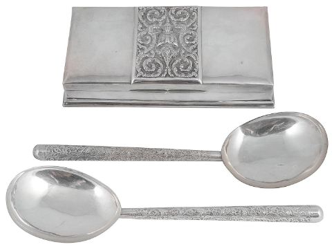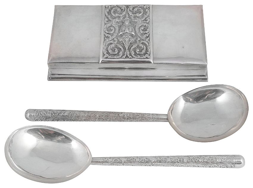 An early 20th century Thai silver table cigarette box and a pair of Sri Lankan white metal servers
