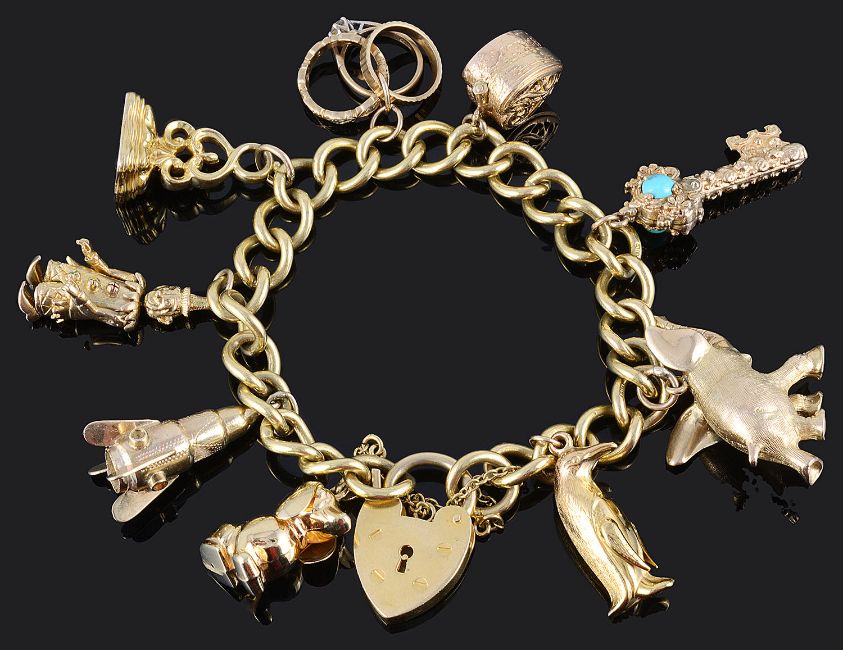 the bracelet having 18ct gold heart padlock fastening and suspended with a variety of mainly 9ct gold charms including a large 9ct gold elephant with ruby eye, a gem set rocket charm, an articulated clown, large turquoise set fancy key, a dachshund, various rings, and a heart shaped opening ring box, together with an amusing penguin charm, tests for gold