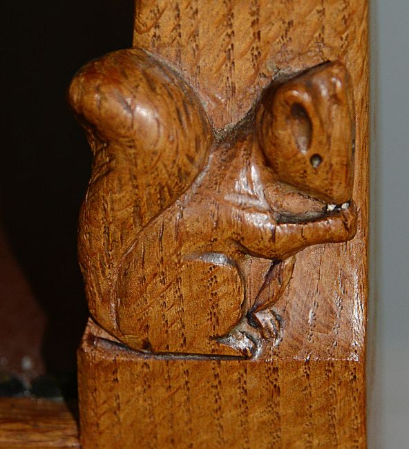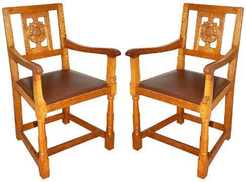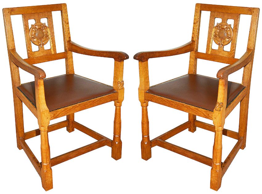 A pair of Wilf 'Squirrelman' Hutchinson oak elbow chairseach with rectangular backs with central splat pierced and carved with a Yorkshire rose, open arms, raised on tapering octagonal front supports united by an H stretcher, carved squirrel signature, brass studded red leather padded seats, (2)height 91 cm.Condition: Some occasional light water spots to back of splat and stretcher on one chair, to other on the side of the armsCollection is required by 4pm on Friday 29th November from the auction venue at Farleigh Golf Club.