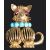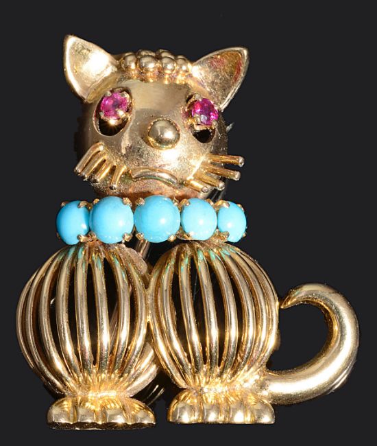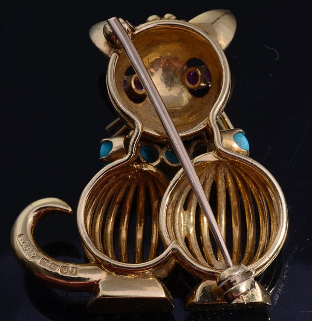 An amusing ruby and turquoise set cat cocktail brooch, circa 1950