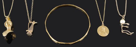 bangle 10.49 gm., Madonna pendant on chain 6.42 gm., helmet charm and chain 9.25 gm., remaining charms and chains 13.72 gm. all weights are approximate