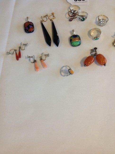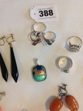 the rose coloured 9ct gold ring of stylised snake head form, stamped 9ct, together with a a large cluster gem set ring, tests gold and a collection of silver jewellery including coral drop and other earrings, silver mounted rings and two diachronic glass pendants, mounts test silver (qty)