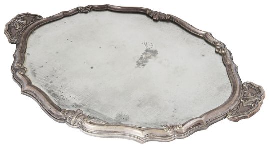 An early 20th century .800 silver mounted wooden twin handled mirror tray