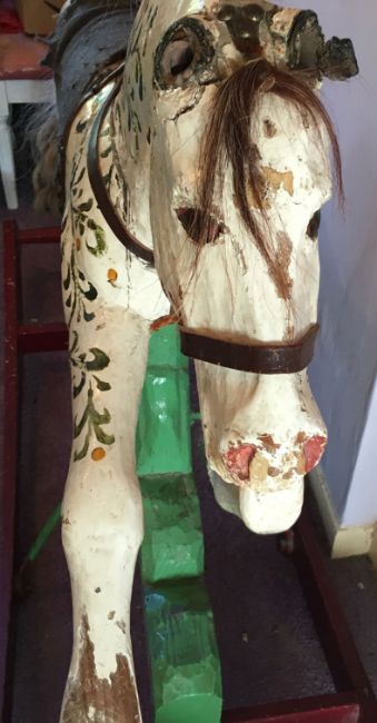 An early 20th century painted rocking horseprobably Continental the white painted horse decorated with green scrolls and hand painted decoration, with leather saddle and reins, the horse jumping a hedge mounted on a rockerlength 152cm, width 49cm, floor to head 100cm, floor to saddle 80cmCondition: The horse is worn but intact. First hand inspection suggested.Please note we would be grateful if collection can be made by 4pm on Friday 29th November from the auction venue at Farleigh Golf Club.