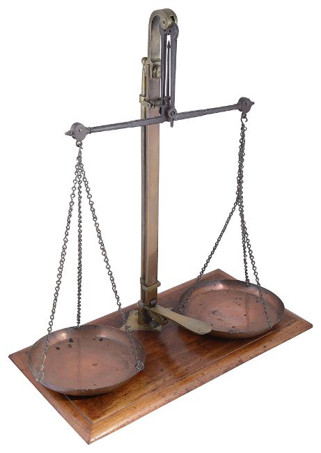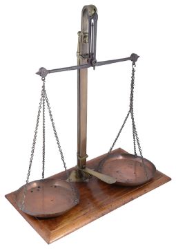 A large set of late 19th century brass and copper balance scales or confectioner's scalesthe collapsible scales with copper pans, central brass lever and levelling screw, mounted on a wooden plinthoverall height 66cm., width 53cmCondition: With split to plinth. General wear and some paint marks to chainsPlease note we would be grateful if collection can be made by 4pm on Friday 29th November from the auction venue at Farleigh Golf Club.