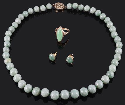 yellow metal mount tests for gold, a pair of small circular jade set ear studs, marked 14ct, together with a green hardstone bead necklace with silver filigree clasp (3)