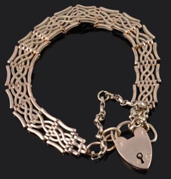 with six twisted bars, safety chain and later heart padlock, the padlock marked 9ct