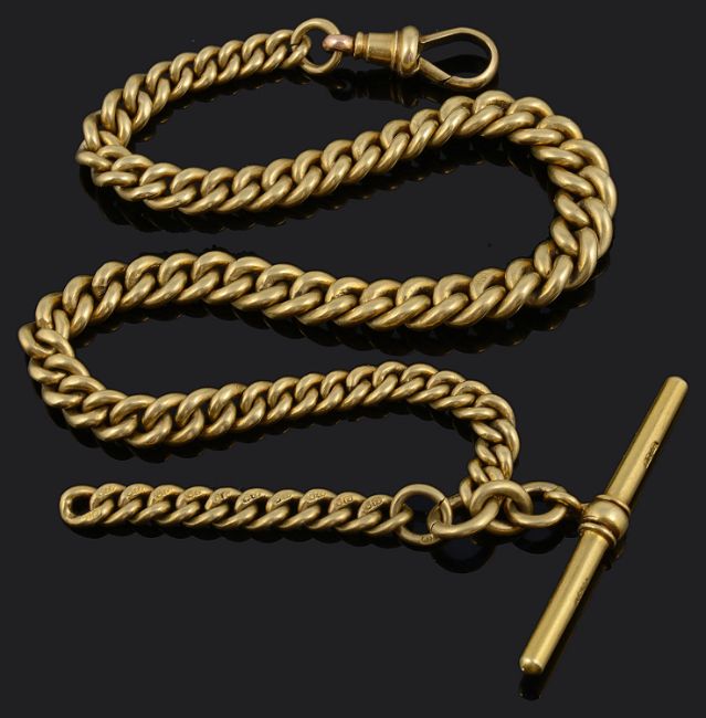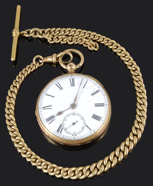 An 18ct gold open faced pocket watch and an 18 ct gold Albert watch chain presented by Alfred Edward Durrant V.C. (1864-1933) to his sonthe circular white enamel dial having black Roman numerals, minute track and subsidiary seconds dial, the movement signed French Royal Exchange, London, 10406, dust cover engraved 'E Durrant V.C. Dad to Sid', engine turned case back having vacant buckle cartouche, together with a heavy 18ct gold curb link watch Albert chain, the chain graduating to either end and with clip to one end and T bar to the other, each link stamped 18ct, in an associated red leather box, (2)first dial diameter 39 mm. approx. 30 cm., watch chain only approx. 48 gmCondition: Hairline crack to enamel watch from centre to edge between 1 and 2 o'clock, Some wear and rubbing to case back decoration. Movement untested. No guarantee can be offered as to the full working order of this pocket watch. Watch chain with some even overall wear commensurate with ageAlfred Edward Durrant and thence by descent. Alfred Edward Durrant (1864-1933) was born on 4th November 1864 in St James, Westminster, London. Little is known about his early life in London before he enlisted with the Rifle Brigade just prior to the Second Boer War. He was soon posted to serve in South Africa in 1899, and was soon involved in some of the early actions of the War. Durrant was recommended for, and awarded the Victoria Cross on 18th October 1901. He received his medal from the Commander-in-Chief of South Africa, Lord Kitchener on 6th October 1902. He was also promoted to Lance-Corporal. For his service in South Africa, he also received the Queen’s South Africa Medal with three clasps, and the King’s South Africa Medal with two clasps. Durrant was later awarded the Imperial Service Medal for 25 years’ service. His medals are held and displayed by the Royal Green Jackets Museum, Winchester, Hampshire.