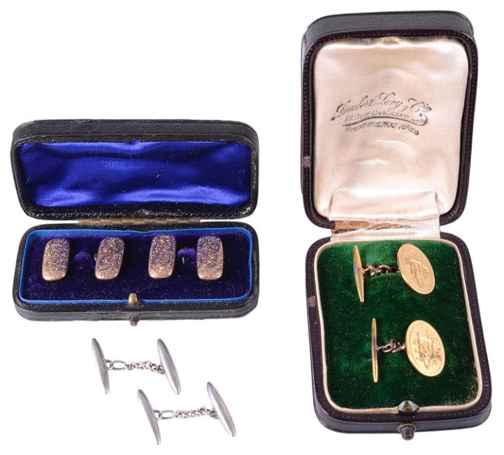 marked for 9ct gold (marks rubbed), fitted box, another pair of oval silver gilt Continental monogrammed oval cufflinks, stamped 900,. fitted box and a pair of simple torpedo shaped chain linked cufflinks, test for silver (3)