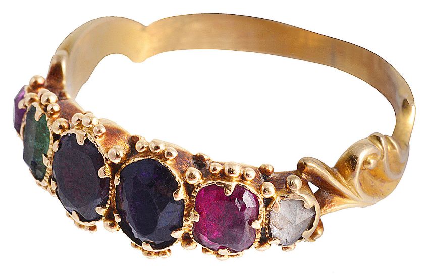 the delicate scroll mount set with a ruby, emerald, garnet, amethyst, ruby and diamond, spelling the word Regard, mount tests for gold, associated oval Victorian ring box
