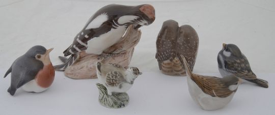comprising Copenhagen: Sparrow no. 1519, Fat Robin no. 2266, Pair of owls no. 834 and Sparrow no. 1081, Bing & Grondahl: Greater Spotter woodpecker on a branch by Dahl Jensen 1717 and 'Baby Bird' 111/2556, (6)