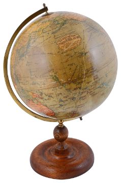 circa 1930, published by 'Geographia Ltd 167 Fleet Street', with half brass meridian ring and with twelve printed paper gores laid onto the papier mache sphere with railways and steamer route distances, on turned wooden base