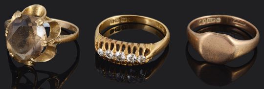 together with a 9ct gold smoky quartz set dress ring and a 9ct gold signet ring (3)