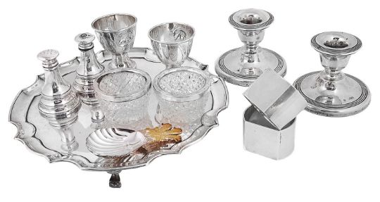 comprising a pair of dwarf squat candlesticks with reeded borders, Chester, 1912 by James Deakin & Sons, a silver caddy spoon commemorating the wedding of Prince Charles and Lady Diana Spencer, 1981 by Roberts and Belk, a pair of plain napkin rings, London, 1935 makers mark worn, a pair of Indian white metal egg cups, each engraved with an elephant, a pair of silver mounted glass salts cut with relief diamonds, a pair of silver salt and pepper pots with weighted bases, a cased set of six tea knives with silver handles, another cased set of tea knives with silver ferrules and a silver plated salver with pie crust border, (14)