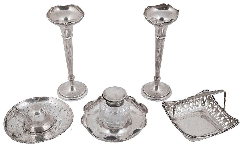 comprising a George V square swing handled bonbon dish, Birmingham, 1911 by T. H. Hazelwood & Co., having pierced sides and beaded rim, a pair of trumpet form spill vases, Birmingham, 1919 by Clark 7 Sewell, having weight bases and shaped rims, a silver mounted cut glass inkwell on stand, London, 1904 by John Grinsell & Sons, the circular stand with wavy edged rim and a Mexican novelty sombrero pin dish with engraved decoration, (4)