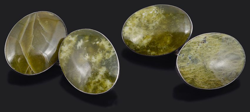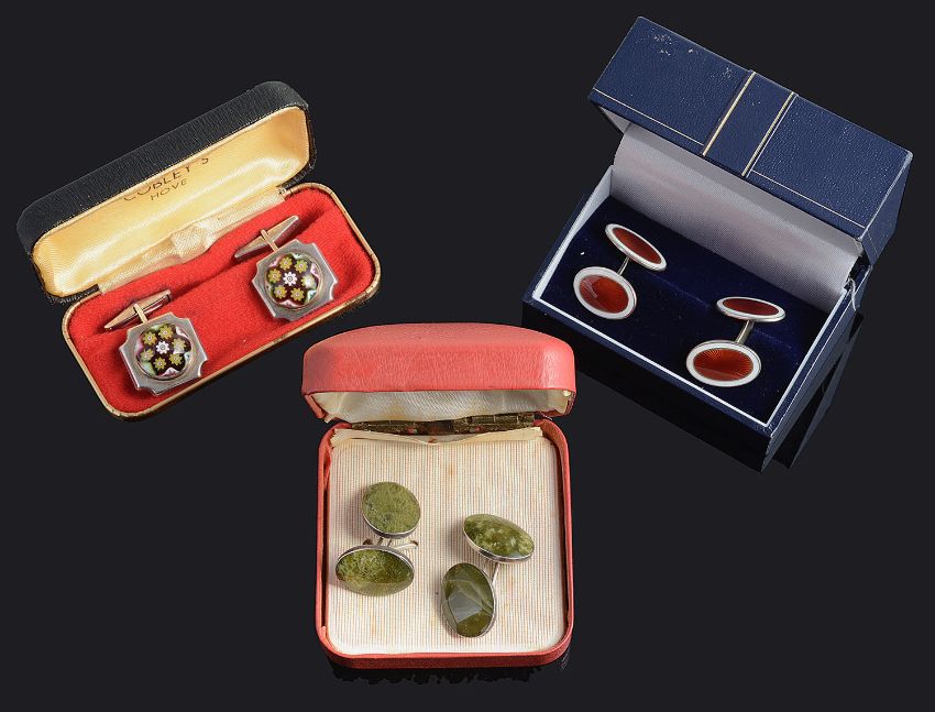 together with a pair of silver mounted millefiore glass set cufflinks and a pair of double sided silver mounted Connemara marble cufflinks (3)