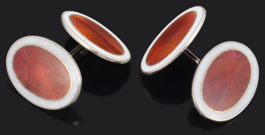 A pair of Norwegian red and white guillioche enamel silver cufflinks