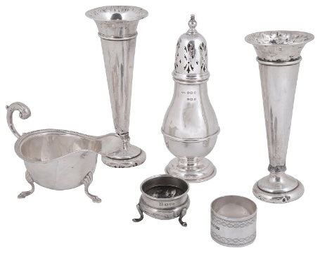 comprising two trumpet shaped spill vases, London, 1908 and 1909, weighted bases, both by William Comyns, a sauce boat, Birmingham, 1937 by S Blanckensee & Son Ltd., a baluster form sugar caster, Birmingham, 1933, makers mark T.S., a Victorian silver napkin ring and a cauldron salt, (6)