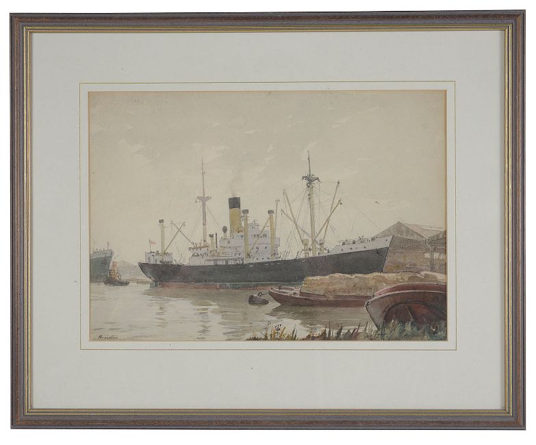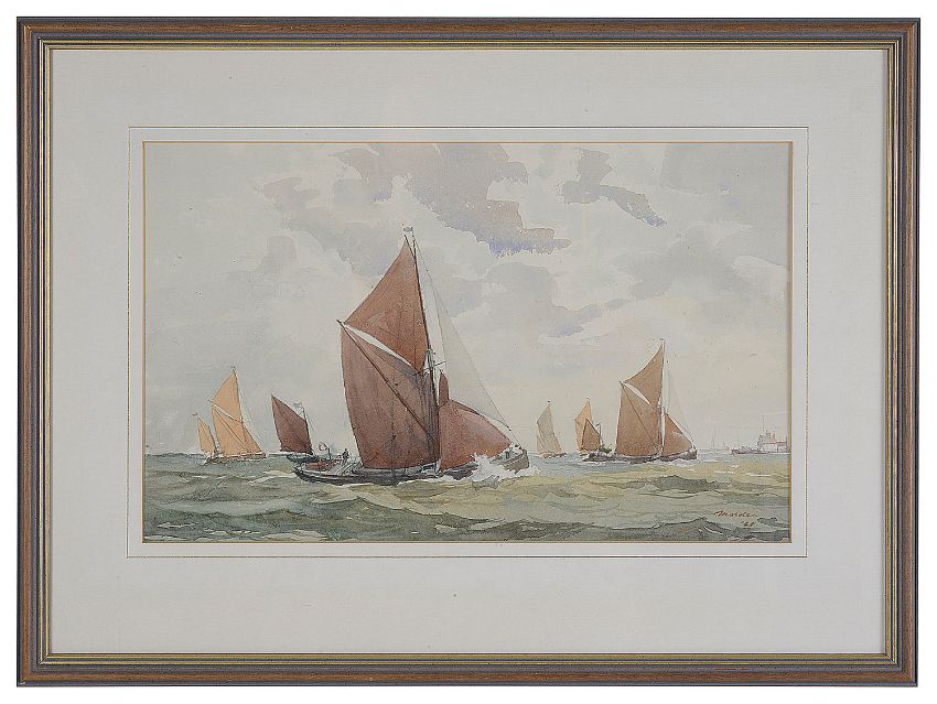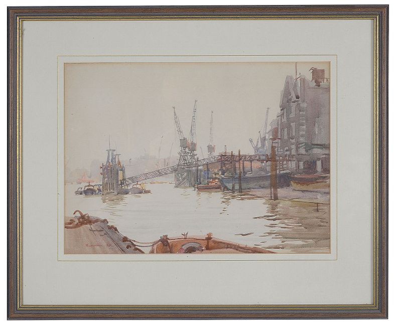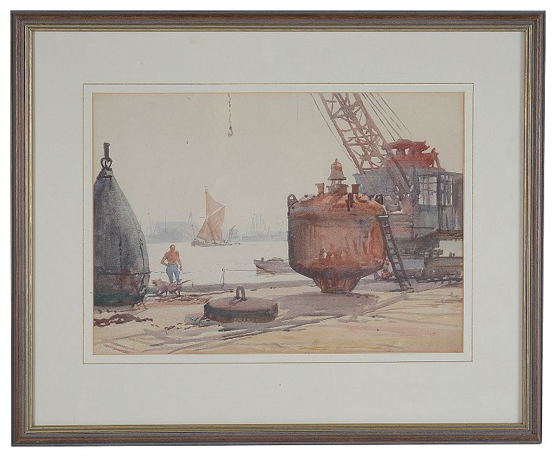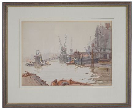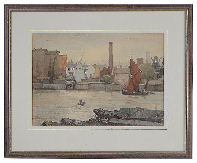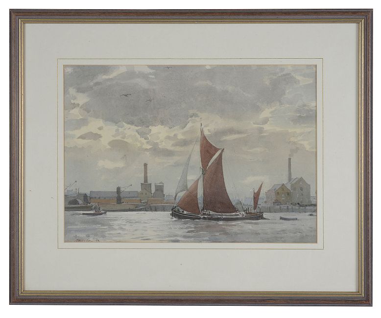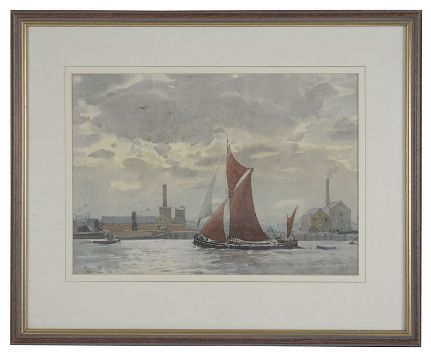 Six working views of the industrial Thames, some with barges under sail others in dock, dated variously between '52 and '68, signed, watercolour, framed (6)