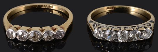 the former having five collet set diamonds, mount stamped 18ct & plat., together with a five stone diamond set half hoop ring, the scroll mount stamped 18ct (2)