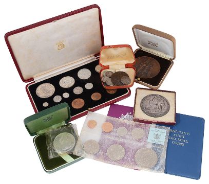 A Royal Mint George VI 1937 specimen coin set and other coins and medallions