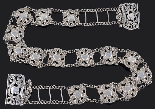 formed of chain linked pierced heart and foliate design shaped panels and having two piece buckle fastener